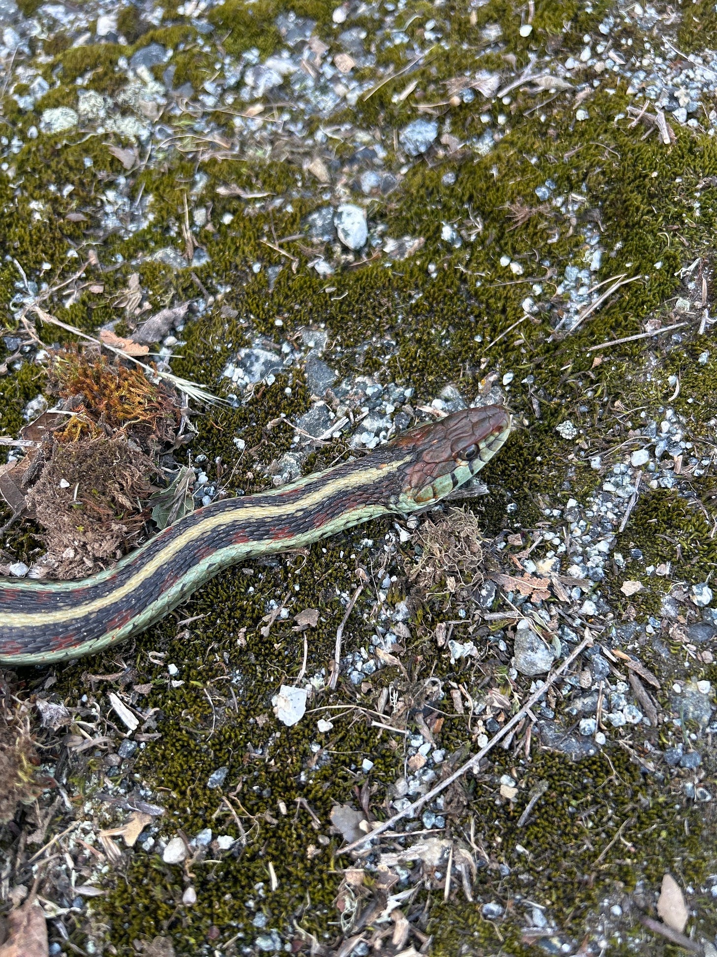 For those willing to brave the rabbit hole of garter snake identification to the subspecific level, this is Thamnophis sirtalis fitchi, with a range extending north as far as southern Alaska. The coastal subspecies, T. s. infernalis, can be found a few miles west in Henry Coe State Park, but I’ve never encountered them on my land.